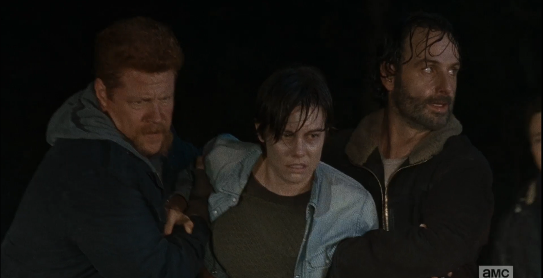 lm 18 abe maggie rick Published May 28, 2016 at 1064 × 546 in The Walking Dead, Season 6, Ep. 16, “Last Day On Earth” Maggie is clearly ill, pale and sweating, as Abraham and Rick gently help her to her knees.