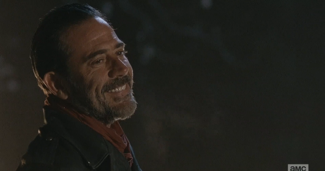 lm 189 oh shit that smile means u getting lucilled Published May 31, 2016 at 1055 × 556 in The Walking Dead, Season 6, Ep. 16, “Last Day On Earth” Negan looks at him, and laughs, silently.