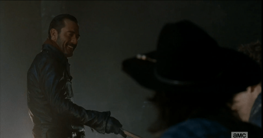 lm 213 negan points bat, rattlesnake music Published May 31, 2016 at 1066 × 561 in The Walking Dead, Season 6, Ep. 16, “Last Day On Earth” His smile widens as he points the bat first at Rick, then at Carl. “This is your kid…”