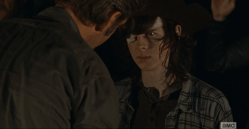 lm 3 carl mh that’s yours, right Published May 28, 2016 at 1058 × 549 in The Walking Dead, Season 6, Ep. 16, “Last Day On Earth” “That’s yours, right?” Carl says nothing, glares in reply. The two hold each other’s stare for a long moment.
