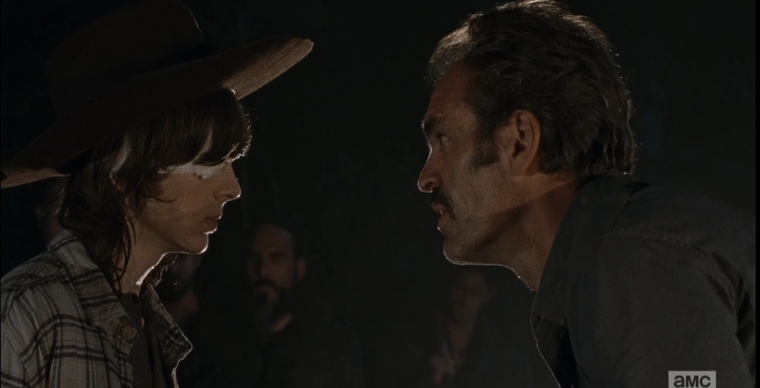 lm 7 staredown Published May 28, 2016 at 1067 × 545 in The Walking Dead, Season 6, Ep. 16, “Last Day On Earth” …and the two stare each other down for a moment longer.