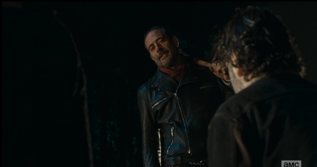 lm 79 negan looks down at rick Published May 31, 2016 at 1064 × 562 in The Walking Dead, Season 6, Ep. 16, “Last Day On Earth” Negan looks down at the man kneeling before him.