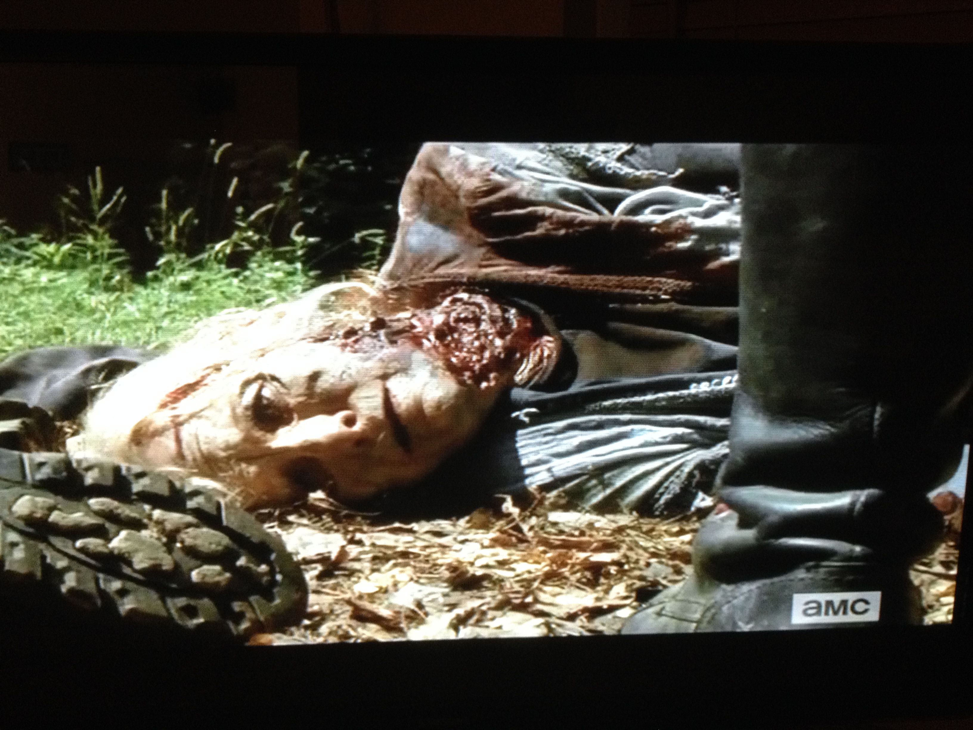 Meanwhile, Richonne is calling for Glenn, and fighting off some mad walkers in their neck of the woods. Rick’s gun runs out of bullets, and the walkers keep coming, so he pulls out the flare gun and aims it for one walker’s head, creating my new walker obsession, affectionately named on Talking Dead as Rick’s Little Bit of Flare Walker: