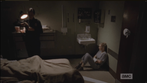 Later, we see Beth, dozing against the wall of Carol’s room, sitting on the floor, looking so sad and lonely there. Carol is Beth’s only friend there, and she is still unconscious. Beth has nobody to turn to, to talk to, and she is just a young girl. She has been through so much, and had to be so strong throughout all the horrible shit that has gone down at this hospital.